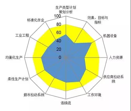 項目結(jié)束時,A公司進行了精益成熟度評估,精益成熟度提升至“80%”,已進入成長期。從矩陣上看,80%的指標得分有了明顯提高,特別是柔性生產(chǎn)計劃、超市拉貨系統(tǒng)、連續(xù)流等指標都取得了驚人的進步。整個公司基本形成了精益改進的企業(yè)文化。